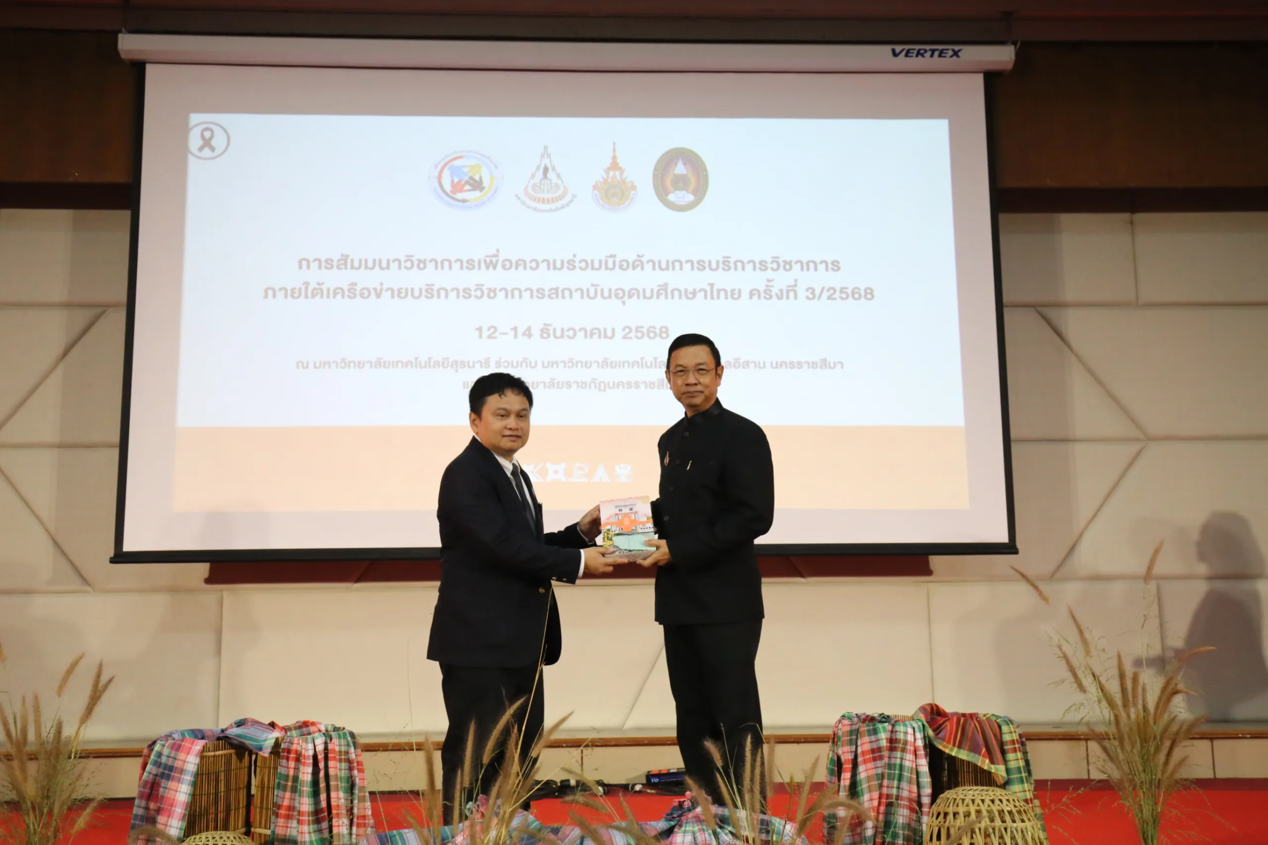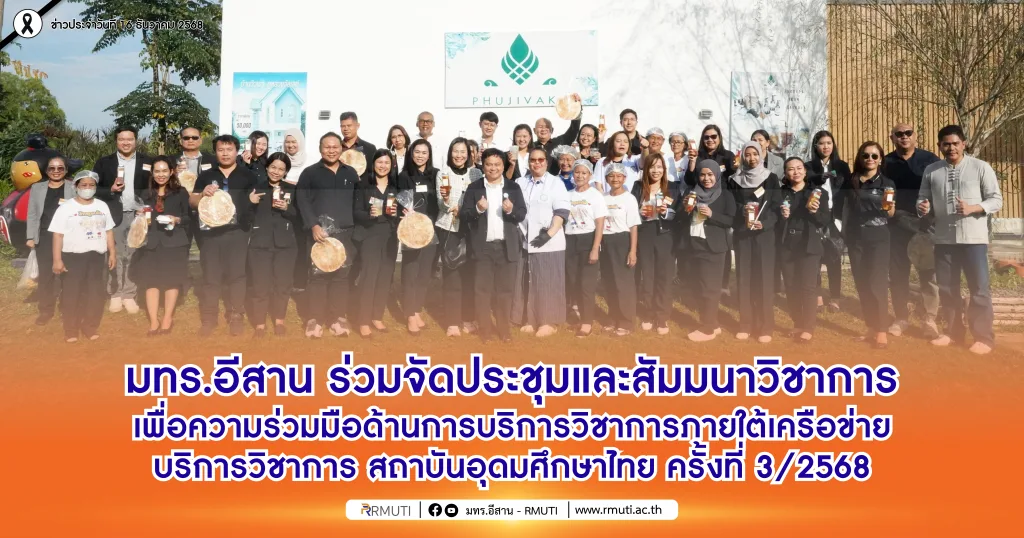วันที่ 13 ธันวาคม 2568 มหาวิทยาลัยเทคโนโลยีราชมงคลอีสาน โดย รองศาสตราจารย์ ดร.โฆษิต ศรีภูธร อธิการบดี มอบหมายให้ รองศาสตราจารย์ ดร.บัณฑิต กฤตาคม รองอธิการบดีฝ่ายวิจัย พัฒนานวัตกรรม และบริการวิชาการ นำคณะผู้บริการได้แก่ ดร.ชยกฤต เพชรช่วย รองผู้อำนวยการฝ่ายบริหารงานทั่วไปสถาบันวิจัยและพัฒนา, ผู้ช่วยศาสตราจารย์จิรวัฒน์ จันทร์สว่าง รองผู้อำนวยการฝ่ายบริการวิชาการสถาบันวิจัยและพัฒนา, ผู้ช่วยศาสตราจารย์เครือวัลย์ มาลาศรี ผู้ช่วยผู้อำนวยการสถาบันวิจัยและพัฒนา และ ดร.สิริกานต์ ไชยสิทธิ์ ร่วมจัด โครงการ “สัมมนาวิชาการเพื่อความร่วมมือด้านการบริการวิชาการ ภายใต้เครือข่ายบริการวิชาการสถาบันอุดมศึกษาไทย” (คบอ.) ครั้งที่ 3/2568 ซึ่งจัดขึ้นระหว่างวันที่ 12 – 14 ธันวาคม 2568 ณ มหาวิทยาลัยเทคโนโลยีสุรนารี จังหวัดนครราชสีมา และวิสาหกิจชุมชนภูชีวกะ อำเภอปักธงชัย จังหวัดนครราชสีมา