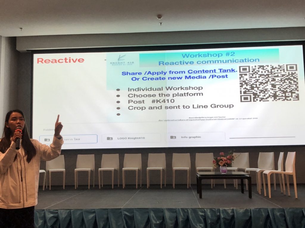 สำหรับภายในงานสัมมนามีการอภิปรายเรียนรู้ในเรื่อง “สถาบันชาติและความมั่นคงในโลกปัจจุบันกับการเรียนรู้ในยุคสังคมออนไลน์” และเรื่อง “การสื่อสารแบบ proactive ในโลก Social Media” จากวิทยากรผู้ทรงคุณวุฒิ ในการให้ความรู้ อภิปราย และแลกเปลี่ยนความคิดเห็นเกี่ยวกับการพัฒนาผู้นำการสื่อสารในเรื่องที่เกี่ยวกับการพิทักษ์และเทิดทูนสถาบันพระมหากษัตริย์ ที่มี Growth Mindset และการใช้การสื่อสารผ่านสื่อสังคมออนไลน์ การเป็นวิทยากร และให้ความรู้เกี่ยวกับวิธีการหรือเทคนิคในการสร้างชุมชนในรูปแบบเครือข่ายในสังคมออนไลน์ รวมทั้งมีการจัดกิจกรรม Workshop ในการออกแบบโครงสร้างผู้นำการสื่อสาร Knight 410 Teacher และสามารถนำองค์ความรู้ที่ได้ไปขยายผลและสร้างชุมชม และในสื่อสังคมออนไลน์เพื่อให้การสื่อสารในเรื่องเกี่ยวกับสถาบันพระมหากษัตริย์ที่ถูกต้องเพื่อธำรงรักษาไว้ซึ่งสถาบันหลักของชาติสืบไป