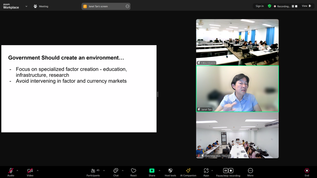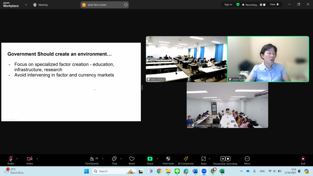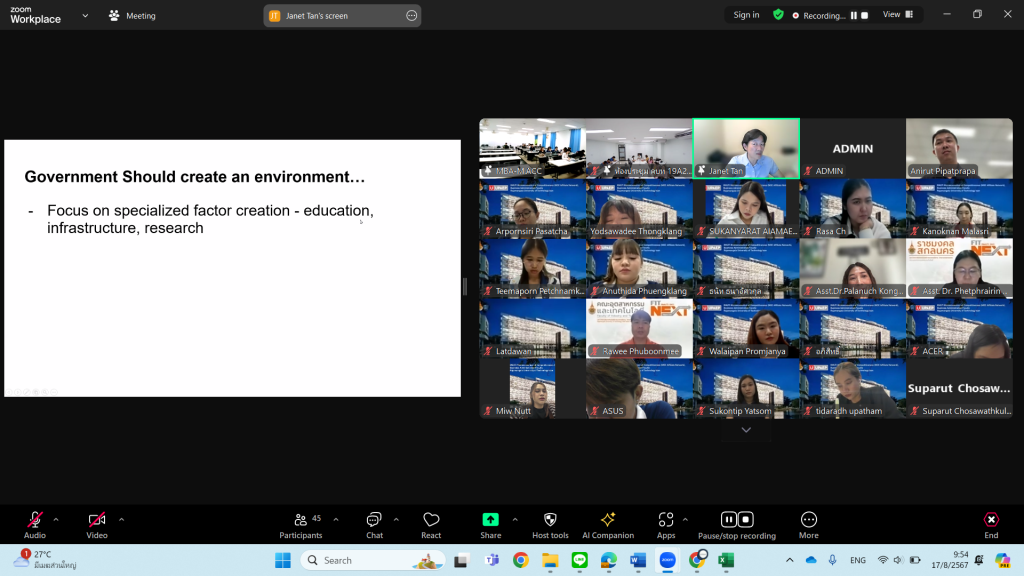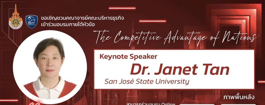 วันที่ 17 สิงหาคม 2567 มหาวิทยาลัยเทคโนโลยีราชมงคลอีสาน โดย อาจารย์ ดร. อนิรุธ พิพัฒน์ประภา คณบดีคณะบริหารธุรกิจ และผู้ช่วยศาสตราจารย์ ดร.พลานุช คงคา เชิญ Dr. Janet Tan จาก San Jose State University ประเทศสหรัฐอเมริกาบรรยายพิเศษเรื่อง Competitive Advantage of Nation ให้กับนักศึกษาบริหารธุรกิจมหาบัณฑิต คณะบริหารธุรกิจ นักศึกษา และคณาจารย์จากวิทยาเขตขอนแก่น วิทยาเขตสุรินทร์ และวิทยาเขตสกลนคร จำนวนกว่า 70 คน โดยอาจารย์ ดร.อนิรุธ พิพัฒน์ประภา คณบดีคณะบริหารธุรกิจ กล่าวเพิ่มเติมว่าครั้งนี้เป็นครั้งที่ 2 ที่ได้มีการเชิญอาจารย์จากเครือข่ายของสถาบัน Microeconomics of Competitiveness, Harvard Business School ประเทศสหรัฐอเมริกา ร่วมบรรยายในการสอนวิชากลยุทธ์และการแข่งขันของหลักสูตรบริหารธุรกิจมหาบัณฑิต ซึ่งมุ่งหวังให้เกิดการเรียนรู้และพัฒนาร่วมกันของนักศึกษา คณาจารย์ด้านบริหารธุรกิจในทุกวิทยาเขตและสร้างความเข้มแข็งทางวิชาการด้านบริหารธุรกิจ มทร.อีสานร่วมกัน