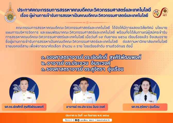 ทั้งนี้ ขอเชิญชวนบุคลากรคณะวิศวกรรมศาสตร์และเทคโนโลยีทุกท่าน ร่วมทำการร่วมหยั่งเสียง (Popular Vote) ผู้สมัครเข้ารับการสรรหาคณบดีคณะวิศวกรรมศาสตร์และเทคโนโลยี ที่ผ่านการพิจารณาจากคณะกรรมการสรรหาฯ ในวันอังคารที่ 23 กันยายน 2586 เวลา 09.00 – 15.00 น. ด้วยวิธีทางอิเล็กทรอนิกส์ ผ่านบัญชีอีเมลสมาชิกของมหาวิทยาลัยฯ จากนั้นผู้สมัครเข้ารับการสรรหาคณบดีคณะวิศวกรรมศาสตร์ ที่ผ่านการพิจารณาจากคณะกรรมการสรรหาฯ จะได้นำเสนอวิสัยทัศน์ นโยบาย แผนการบริหารจัดการและแผนพัฒนาคณะวิศวกรรมศาสตร์ต่อสภามหาวิทยาลัยฯ ในวันศุกร์ที่ 26 กันยายน 2568 เพื่อทำการลงมติพิจารณาคัดเลือกผู้สมควรเข้ารับตำแหน่งคณบดีคณะวิศวกรรมศาสตร์และเทคโนโลยี และประกาศอย่างเป็นทางการต่อไป