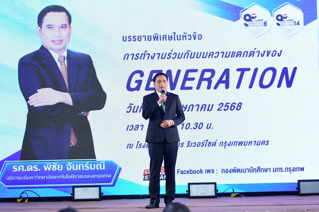 จากนั้น ได้รับเกียรติจาก รองศาสตราจารย์ ดร.พิชัย จันทร์มณี อธิการบดีมหาวิทยาลัยเทคโนโลยีราชมงคลกรุงเทพ กล่าวต้อนรับผู้เข้าร่วมโครงการ และกล่าวปาฐกถาในหัวข้อ : การทำงานร่วมกันบนความแตกต่างของ Generation