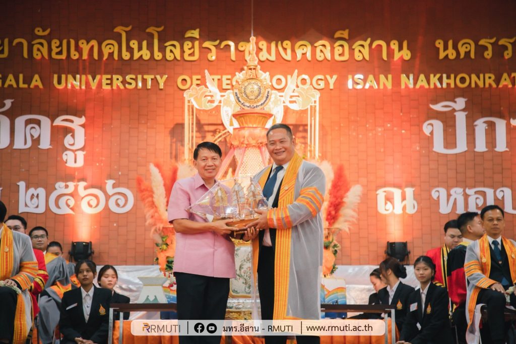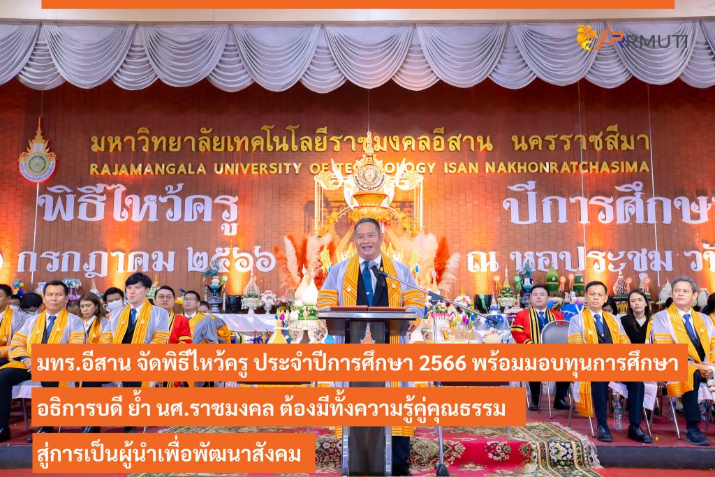 วันที่ 20 กรกฎาคม 2566 มหาวิทยาลัยเทคโนโลยีราชมงคลอีสาน โดย รองศาสตราจารย์ ดร.โฆษิต ศรีภูธร อธิการบดีมหาวิทยาลัยเทคโนโลยีราชมงคลอีสาน เป็นประธานในพิธีไหว้ครู ประจำปีการศึกษา 2566 ซึ่งจัดโดย สภานักศึกษา องค์การนักศึกษา สโมสรนักศึกษา และชมรมต่างๆ ที่ร่วมแรง ร่วมใจกันจัดขึ้น ณ หอประชุม วทัญญู ณ ถลาง โดยมี คณะผู้บริหาร จากวิทยาเขตขอนแก่น วิทยาเขตสกลนคร วิทยาเขตสุรินทร์ คณาจารย์ อาจารย์ผู้เกษียนอายุราชการประจำปีงบประมาณ พ.ศ. 2566 พนักงาน เจ้าหน้าที่ และนักศึกษาเข่าวมพิธีกว่า 4,000 คน ภายใต้มาตรการป้องกัน COVID-19 สำหรับการจัดกิจกรรมไหว้ครูที่มหาวิทยาลัยได้ร่วมกับนักศึกษาจัดขึ้น เพื่อให้ศิษย์ได้ระลึกถึงและแสดงความกตัญญูกตเวที แสดงความเคารพต่อครูบาอาจารย์ และยังเป็นกิจกรรมที่นักศึกษาจะได้แสดงออกถึงความคิดสร้างสรรค์ ความสามารถในการประดิษฐ์พานธูปเทียน ดอกไม้ ซึ่งจะใช้ประกวดและมอบแด่ครูอาจารย์ที่เข้าร่วมในพิธี ทั้งนี้ เมื่อวันที่ 19 กรกฎาคม 2566 ได้ มทร.อีสาน มีการจัดการการแข่งขันการประกวดการจัดพานดอกไม้และพานธูปเทียนขึ้น ณ ห้องตะโกราย 1 อาคารสำนักส่งเสริมวิชาการและงานทะเบียน (อาคาร 35) ซึ่งแบ่งประเภทการแข่งขัน เป็น 2 ประเภท ได้แก่ ประเภทสวยงาม และประเภทความคิดสร้างสรรค์ โดยมีผลการแข่งขัน ดังนี้