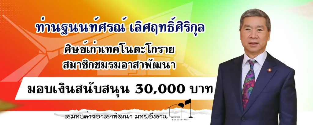 จากนั้นเป็นพิธีมอบเงินสนับสนุนค่าย จำนวน 30,000 บาท สมทบค่ายอาสาพัฒนา มทร.อีสาน จาก ท่านฐนนท์ศรณ์ เลิศฤทธิ์ศิริกุล กรรมการบริหาร/กรรมการผู้อำนวยการ บริษัท ปรีชากรุ๊ป จำกัด (มหาชน) ศิษย์เก่าเทคโนตะโกราย สมาชิกชมรมอาสาพัฒนา
