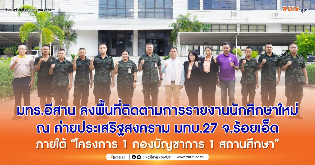 วันที่ 17 กรกฎาคม 2568 มหาวิทยาลัยเทคโนโลยีราชมงคลอีสาน โดย รองศาสตราจารย์ ดร.โฆษิต ศรีภูธร อธิการบดี มทร.อีสาน มอบหมายให้ ผู้ช่วยศาสตราจารย์ ดร.เอนก เจริญภักดี รองอธิการบดีฝ่ายยุทธศาสตร์ นโยบายและแผน พร้อมด้วย ร.ต.เชิดศักดิ์ อาจหาญ ผบ.มว.ร้อย.สห.มทบ.27 ซึ่งได้รับมอบหมายจาก พลตรี กิตติศักดิ์ ถาวร เสนาธิการ กองทัพภาคที่ 2 และ พ.อ.ดร. ชวฤทธ์ณัฏฐ์ ศุภกิจ ตำแหน่ง นปก.ประจำ มทบ.21/ ผู้อำนวยการศูนย์ประสานงาน 1 กองบัญชาการ 1 สถานศึกษา (กองทัพภาคที่ 2) ให้ติดตามการรายงานตัวเข้าศึกษา การถ่ายรูปเพื่อทำบัตรประจำตัวนักศึกษา และติดตามเรียนการสอนภายใต้ “โครงการ 1 กองบัญชาการ 1 สถานศึกษา” ณ ค่ายประเสริฐสงคราม มทบ.27 อำเภอเมืองร้อยเอ็ด จังหวัดร้อยเอ็ด