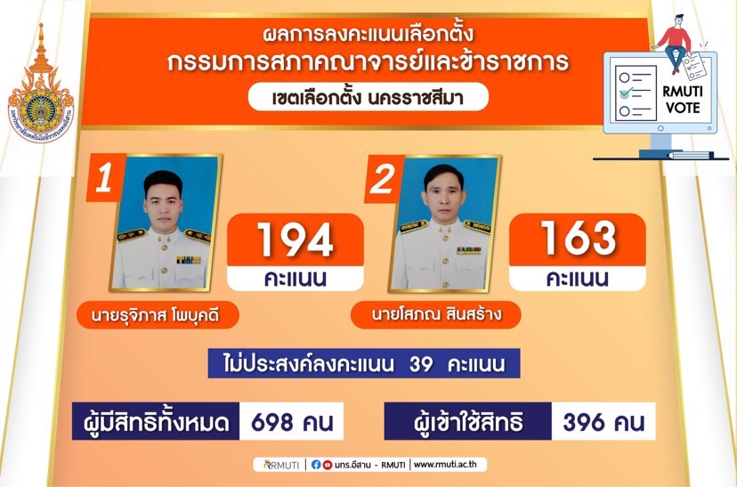 หมายเลข 1 นายรุจิภาส โพบุคดี เป็นผู้ชนะคะแนนการเลือกตั้ง ได้รับเลือกเป็น กรรมการสภาคณาจารย์และข้าราชการ (แทนตำแหน่งที่ว่าง) พ.ศ. 2565 เขตเลือกตั้ง มทร.อีสาน นครราชสีมา โดยได้รับคะแนนการเลือกตั้งด้วยคะแนน 194 คะแนน จากจำนวนผู้มาใช้สิทธิ์ 396 คน และมีผู้ไม่ประสงค์ลงคะแนน 39 คน