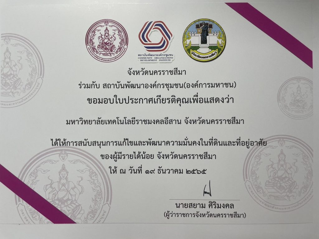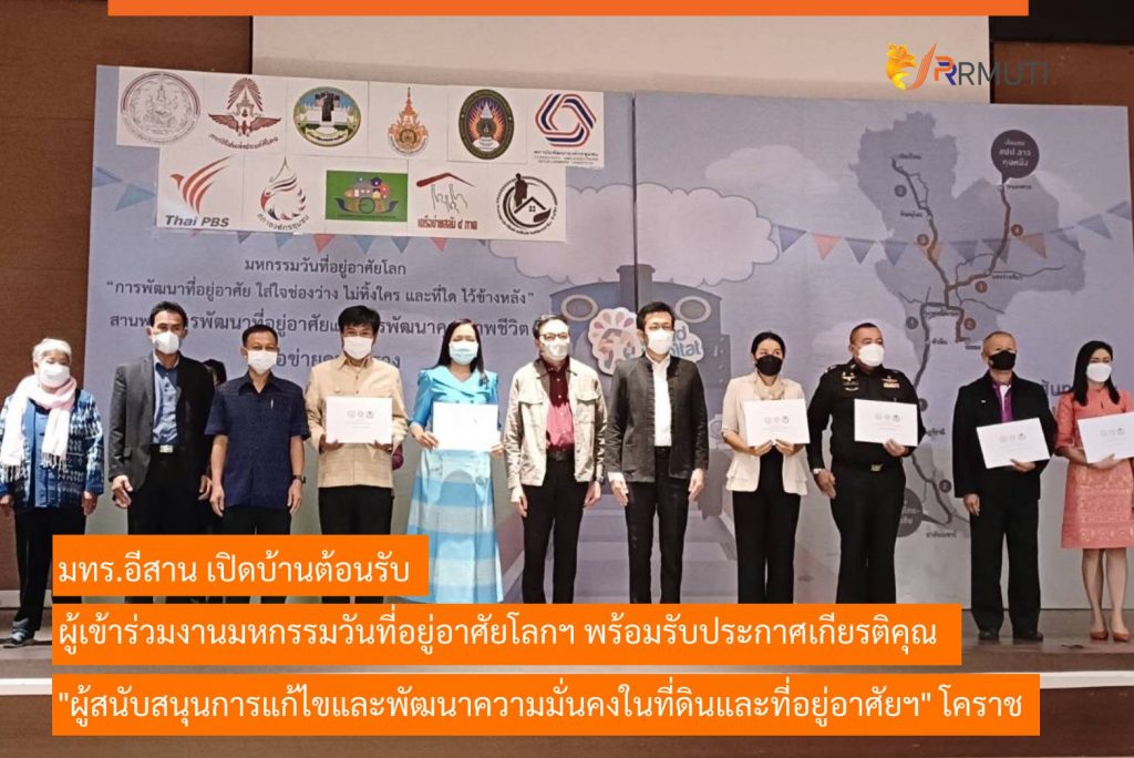 วันที่ 20 ธันวาคม 2565 มหาวิทยาลัยเทคโนโลยีราชมงคลอีสาน โดย รองศาตราจารย์ ดร.โฆษิต  ศรีภูธร อธิการบดีมหาวิทยาลัยเทคโนโลยีราชมงคลอีสาน มอบหมายให้ ผู้ช่วยศาสตราจารย์ณรงค์ ผลวงษ์ รองอธิการบดีฝ่ายบริหารและพัฒนาทรัพยากรมนุษย์ และผู้ช่วยศาสตราจารย์สุรพจน์  วัชโรภากุล รองอธิการบดีฝ่ายกิจการนักศึกษาและศิษย์เก่าสัมพันธ์  เข้ารับมอบประกาศเกียรติคุณในฐานะหน่วยงานที่ให้การสนับสนุนการแก้ไขและพัฒนาความมั่นคงในที่ดินและที่อยู่อาศัยของผู้มีรายได้น้อย จ.นครราชสีมา ในงานมหกรรมวันที่อยู่อาศัยโลก ประเทศไทย ภาคตะวันออกเฉียงเหนือ “การพัฒนาที่อยู่อาศัย ใส่ใจช่องว่าง ไม่ทิ้งใคร และที่ใด ไว้ข้างหลัง”สู่การพัฒนาคุณภาพชีวิตเครือข่ายคนริมทางรถไฟ ระหว่างวันที่ 19 – 20 ธันวาคม 2565  ณ ห้องตะโกราย 2 อาคารสำนักส่งเสริมวิชาการและงานทะเบียน (อาคาร 35) ซึ่งจัดโดย จังหวัดนครราชสีมา เครือข่ายสลัม 4 ภาค เครือข่ายริมรางเมืองย่าโม ขบวนองค์กรชุมชนจังหวัดนครราชสีมา  ร่วมกับ สถาบันพัฒนาองค์กรชุมชน (องค์การมหาชน) สำนักงานภาคตะวันออกเฉียงเหนือ โดยงานนี้ได้รับเกียรติจาก นายสมเกียรติ วิริยะกุลนันท์ รองผู้ว่าราชการจังหวัดนครราชสีมา เป็นประธานเปิดงาน