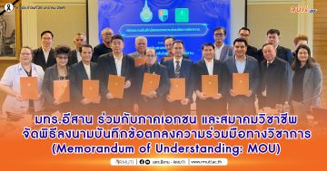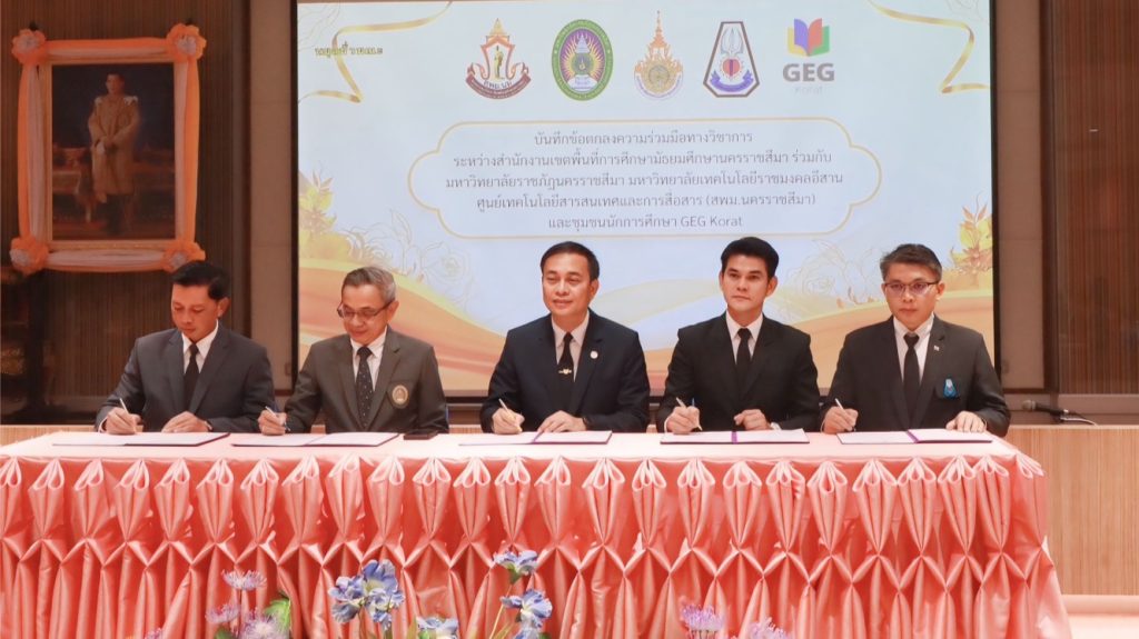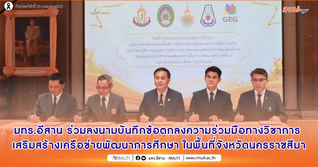 วันที่ 22 มกราคม พ.ศ. 2569 มหาวิทยาลัยเทคโนโลยีราชมงคลอีสาน โดย รองศาสตราจารย์ ดร.โฆษิต ศรีภูธร อธิการบดี มทร.อีสาน ได้มอบหมายให้ อาจารย์ธนินทร์ ระเบียบโพธิ์ ผู้ช่วยอธิการบดี เป็นผู้แทนมหาวิทยาลัยฯ เข้าร่วมลงนามในพิธีลงนามบันทึกข้อตกลงความร่วมมือทางวิชาการ ระหว่าง สำนักงานเขตพื้นที่การศึกษามัธยมศึกษานครราชสีมา มหาวิทยาลัยเทคโนโลยีราชมงคลอีสาน มหาวิทยาลัยราชภัฏนครราชสีมา ศูนย์เทคโนโลยีสารสนเทศและการสื่อสาร (สพม.นครราชสีมา) และชุมชนนักการศึกษา GEG Korat เพื่อส่งเสริมและพัฒนาศักยภาพครู บุคลากรทางการศึกษา ตลอดจนยกระดับคุณภาพการจัดการเรียนการสอนด้วยเทคโนโลยีและนวัตกรรมทางการศึกษา การลงนามครั้งนี้ได้รับเกียรติจาก ว่าที่ร้อยเอก ดร.ทิณกรณ์ ภูโทถ้ำ ผู้อำนวยการสำนักงานเขตพื้นที่การศึกษามัธยมศึกษานครราชสีมา รองศาสตราจารย์ ดร.อดิศร เนาวนนท์ อธิการบดีมหาวิทยาลัยราชภัฏนครราชสีมา นายสราวุฒิ แช่มเมืองปัก ประธานศูนย์เทคโนโลยีสารสนเทศและการสื่อสาร (สพม.นครราชสีมา) และ นายสวรรค์ ดวงมณี ผู้นำชุมชนนักการศึกษา GEG Korat ร่วมลงนามและเป็นสักขีพยานสำคัญ ณ ห้องประชุมสระบัว หอประชุมราชภัฏรังสฤษฏ์ มหาวิทยาลัยราชภัฏนครราชสีมา