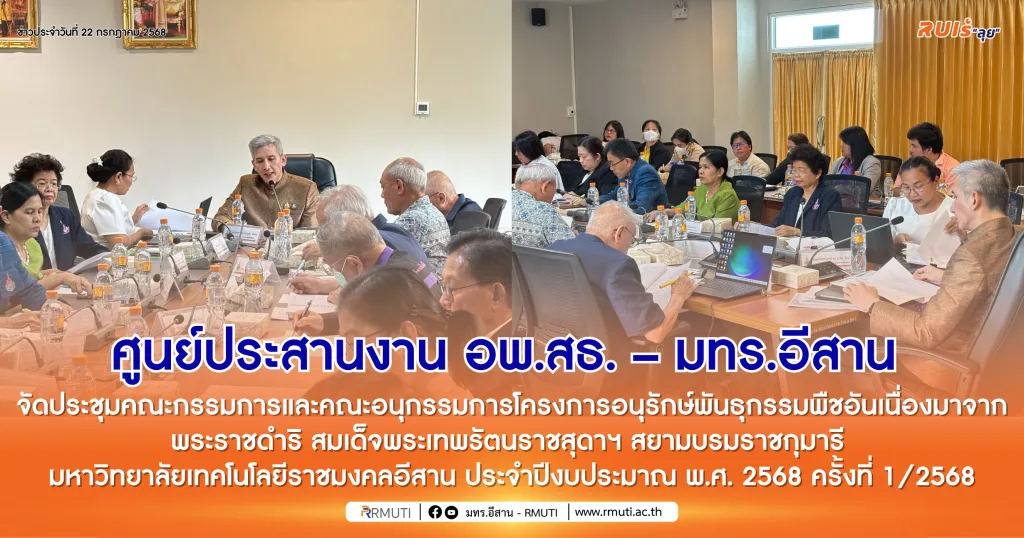วันที่ 21 กรกฎาคม 2568 ศูนย์ประสานงาน อพ.สธ. – มหาวิทยาลัยเทคโนโลยีราชมงคลอีสาน จัดประชุมคณะกรรมการและคณะอนุกรรมการโครงการอนุรักษ์พันธุกรรมพืชอันเนื่องมาจากพระราชดำริ สมเด็จพระเทพรัตนราชสุดาฯ สยามบรมราชกุมารี มหาวิทยาลัยเทคโนโลยีราชมงคลอีสาน ประจำปีงบประมาณ พ.ศ. 2568 ครั้งที่ 1/2568 ณ ห้องประชุมสาธร 1 สำนักงานอธิการบดี ศูนย์การศึกษาหนองระเวียง มหาวิทยาลัยเทคโนโลยีราชมงคลอีสาน ตำบลหนองระเวียง อำเภอเมือง จังหวัดนครราชสีมา โดยมีวาระการประชุมหลัก คือ สรุปผลการดำเนินงาน ประจำปีงบประมาณ 2568 รายงานความก้าวหน้าในการดำเนินงาน ประจำปีงบประมาณ 2568 รายงานผลการดำเนินงานของศูนย์ประสานงาน อพ.สธ. – มหาวิทยาลัยเทคโนโลยีราชมงคลอีสาน ประจำปีงบประมาณ 2568 สรุปผลการประชุมคณะอนุกรรมการ/คณะทำงาน อพ.สธ. – มหาวิทยาลัยเทคโนโลยีราชมงคลอีสาน โดยมีผู้ช่วยศาสตราจารย์ ดร.ระบิล พ้นภัย รองอธิการบดีฝ่ายวิชาการและวิเทศสัมพันธ์ เป็นประธานการประชุม พร้อมด้วยท่านที่ปรึกษา อพ.สธ. – มทร.อีสาน คณะผู้บริหาร คณาจารย์ บุคลากร ของมหาวิทยาลัย ทั้ง 4 แห่ง ได้แก่ มทร.อีสาน นครราชสีมา/วิทยาเขตสุรินทร์/วิทยาเขตขอนแก่น/วิทยาเขตสกลนคร ซึ่งเป็นคณะกรรมการและคณะอนุกรรมการ เข้าร่วมประชุม