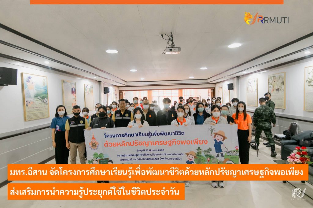 วันที่ 22 มีนาคม 2566 มหาวิทยาลัยเทคโนโลยีราชมงคลอีสาน โดย รองศาสตราจารย์ ดร.โฆษิต ศรีภูธร อธิการบดีมหาวิทยาลัยเทคโนโลยีราชมงคลอีสาน มอบหมายให้ งานพัฒนาทักษะวินัย และประสบการณ์นักศึกษา กองพัฒนานักศึกษา จัดโครงการศึกษาเรียนรู้เพื่อพัฒนาชีวิตด้วยหลักปรัชญาเศรษฐกิจพอเพียง ณ ศูนย์การเรียนรู้เศรษฐกิจพอเพียงภาคตะวันออกเฉียงเหนือ ค่ายสุรนารี อำเภอเมืองนครราชสีมา จังหวัดนครราชสีมา ทั้งนี้ ได้รับเกียรติจากอาจารย์สรวิศ ต.ศิริวัฒนา ผู้ช่วยอธิการบดี มทร.อีสาน เป็นประธานกล่าวเปิดโครงการ โดยมีนางสาวสุวรรณี ทนงสำโรง พลเสน รักษาราชการแทนผู้อำนวยการกองพัฒนานักศึกษา พร้อมด้วยบุคลากรกองพัฒนานักศึกษาเข้าร่วมในงานดังกล่าว  ซึ่งมีนักศึกษาข้าร่วม จำนวนทั้งสิ้น 100 คน ซึ่งภายในโครงการมีกิจกรรมการบรรยายให้ความรู้ เรื่อง“ในหลวงรัชกาลที่ 9 กับหลักปรัชญาเศรษฐกิจพอเพียง” โดย จ.ส.อ. รุ่งโรจน์  ดอนจังหรีด การบรรยายให้ความรู้ เรื่อง การเรียนรู้ตามหลักปรัชญาเศรษฐกิจพอเพียง หลักปรัชญา ปัญญาชาวบ้าน บัญชีครัวเรือน พืชสวน พืชสมุนไพร โดยจ.ส.ต.วัชรากรณ์  ช่วยพันธ์ กิจกรรมฐานการเรียนรู้ตามหลักปรัชญาเศรษฐกิจพอเพียง โดย จ.ส.อ.กฤษดากร  กรองไตย และ ส.ท.อิสระ  รุ่งสันเทียะ และการสรุปกิจกรรมการเรียนรู้ตามหลักปรัชญาเศรษฐกิจพอเพียง