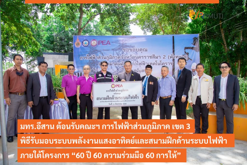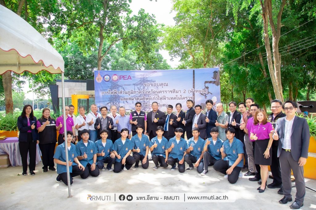 วันที่ 23 สิงหาคม 2566 มหาวิทยาลัยเทคโนโลยีราชมงคลอีสาน โดย รองศาสตราจารย์ ดร.โฆษิต ศรีภูธร อธิการบดีมหาวิทยาลัยเทคโนโลยีราชมงคลอีสาน (มทร.อีสาน) พร้อมคณะผู้บริหารมหาวิทยาลัย พร้อมได้กล่าวต้อนรับ คณะฯ การไฟฟ้าส่วนภูมิภาค เขต 3 (ภาคตะวันออกเฉียงเหนือ) จังหวัดนครราชสีมา ในพิธีรับมอบระบบพลังงานแสงอาทิตย์และสนามฝึกด้านระบบไฟฟ้า ภายใต้โครงการ “60 ปี 60 ความร่วมมือ 60 การให้” จาก การไฟฟ้าส่วนภูมิภาค เขต 3 โดยได้รับเกียรติจาก นายประสิทธิ์ จันทร์ประสิทธิ์ ผู้ช่วยผู้ว่าการ การไฟฟ้าส่วนภูมิภาค เขต 3 (ภาคตะวันออกเฉียงเหนือ) จ.นครราชสีมา เป็นประธานในพิธี และมี นายยงยุทธ เลาห์ทวี ผจก.กฟจ.นม. 2 หทล. กล่าวรายงานการดำเนินงานส่งมอบ ณ บริเวณด้านหน้าสนามฝึกด้านระบบไฟฟ้า ศูนย์การศึกษาหนองระเวียงมหาวิทยาลัยเทคโนโลยีราชมงคลอีสาน และได้เยี่ยมชมสนามฝึกด้านระบบไฟฟ้า ชมการฝึกซ้อมการปฏิบัติงานกับระบบไฟฟ้าโดยมีเจ้าหน้าที่การไฟฟ้าภูมิภาค เขต 3และนักศึกษา มทร.อีสาน ทำการฝึกร่วมกัน