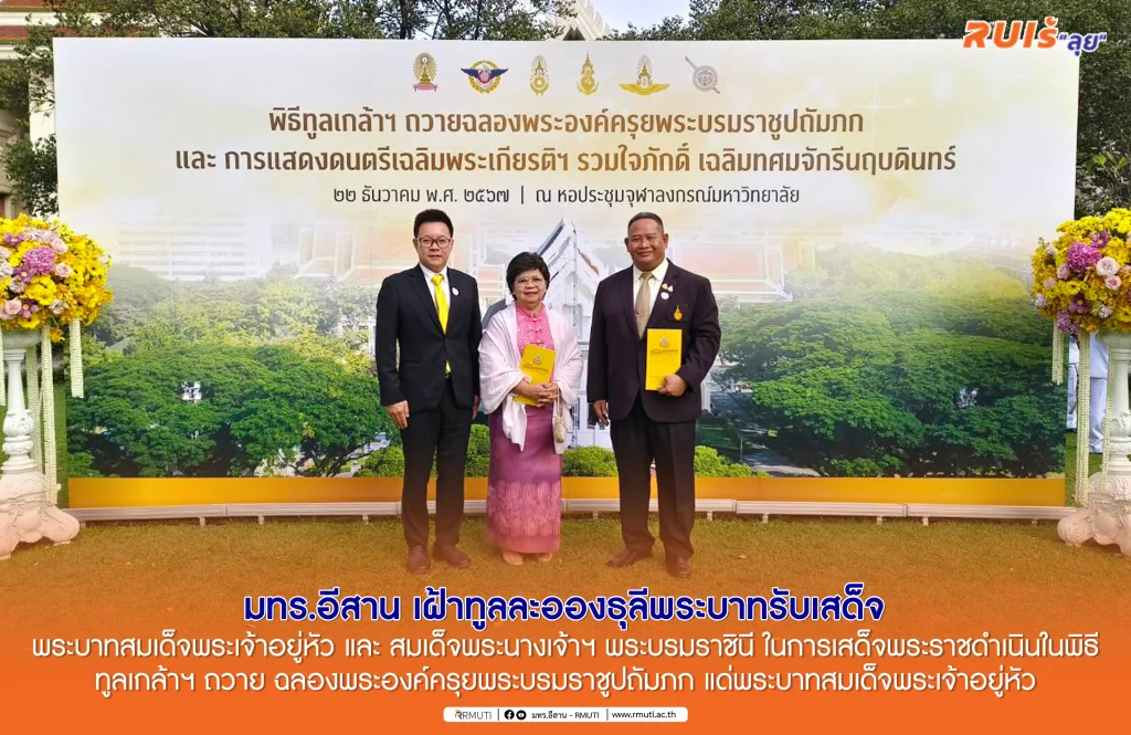 วันที่ ๒๒ ธันวาคม ๒๕๖๗ มหาวิทยาลัยเทคโนโลยีราชมงคลอีสาน นำโดย ศาสตราจารย์พิเศษสุรเกียรติ์ เสถียรไทย นายกสภาจุฬาลงกรณ์มหาวิทยาลัย และ ประธานที่ปรึกษากิตติมศักดิ์ มทร.อีสาน รองศาสตราจารย์ ดร.โฆษิต ศรีภูธร อธิการบดี มทร.อีสาน ผู้ช่วยศาสตราจารย์ ดร.อภิชาต ติรประเสริฐสิน รองอธิการบดีฝ่ายเทคโนโลยีดิจิทัล สารสนเทศ และกิจการสภามหาวิทยาลัย ร่วมเฝ้าทูลละอองธุลีพระบาทรับเสด็จ พระบาทสมเด็จพระเจ้าอยู่หัว และ สมเด็จพระนางเจ้าฯ พระบรมราชินี ในการเสด็จพระราชดำเนินในพิธีทูลเกล้า ฯ ถวายฉลองพระองค์ครุยพระบรมราชูปถัมภก แด่พระบาทสมเด็จพระเจ้าอยู่หัว และ ทอดพระเนตรการแสดงดนตรี “รวมใจภักดิ์ เฉลิมทศมจักรีนฤนดินทร์ : มหาดุริยางค์ไทย – สากล เฉลิมพระเกียรติพระบาทสมเด็จพระเจ้าอยู่หัว” ในโอกาสพิธีมหามงคลเฉลิมพระชนมพรรษา ๖ รอบ ซึ่งเป็นความร่วมมือระหว่างจุฬาลงกรณ์มหาวิทยาลัย ร่วมกับกองทัพไทย – สำนักงานตำรวจแห่งชาติ ณ หอประชุมจุฬาลงกรณ์มหาวิทยาลัย
