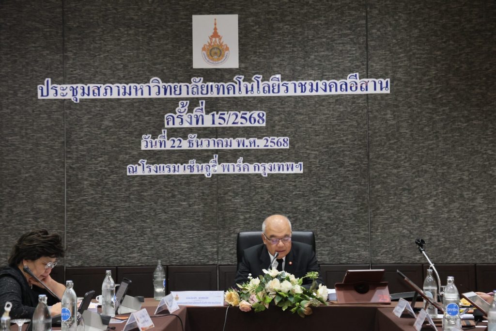วันจันทร์ที่ 22 ธันวาคม พ.ศ. 2568 เวลา 13.00 น. มหาวิทยาลัยเทคโนโลยีราชมงคลอีสาน จัดการประชุมสภามหาวิทยาลัยเทคโนโลยีราชมงคลอีสาน ครั้งที่ 15/2568 โดยมี นายฉัตรชัย พรหมเลิศ นายกสภามหาวิทยาลัยเทคโนโลยีราชมงคลอีสาน เป็นประธานการประชุม เพื่อกำหนดนโยบาย ทิศทาง และพิจารณาประเด็นสำคัญด้านการบริหารจัดการและการพัฒนามหาวิทยาลัยให้เป็นไปตามพันธกิจและยุทธศาสตร์ที่กำหนดไว้ ซึ่งการประชุมครั้งนี้จัดขึ้นในรูปแบบ Hybrid Meeting ควบคู่ระหว่างการประชุม ณ สถานที่จริง และการประชุมผ่านระบบออนไลน์ Zoom Meeting เพื่ออำนวยความสะดวกแก่กรรมการสภามหาวิทยาลัยฯ และผู้ที่เกี่ยวข้อง โดยมี กรรมการสภามหาวิทยาลัยผู้ทรงคุณวุฒิ กรรมการสภามหาวิทยาลัยฯ และที่ปรึกษามหาวิทยาลัยฯ เข้าร่วมประชุมอย่างพร้อมเพรียง ณ ห้องประชุมคริสตัล 3–4 ชั้น 3 โรงแรมเซ็นจูรี พาร์ค กรุงเทพมหานคร รวมถึงการเข้าร่วมผ่านระบบออนไลน์