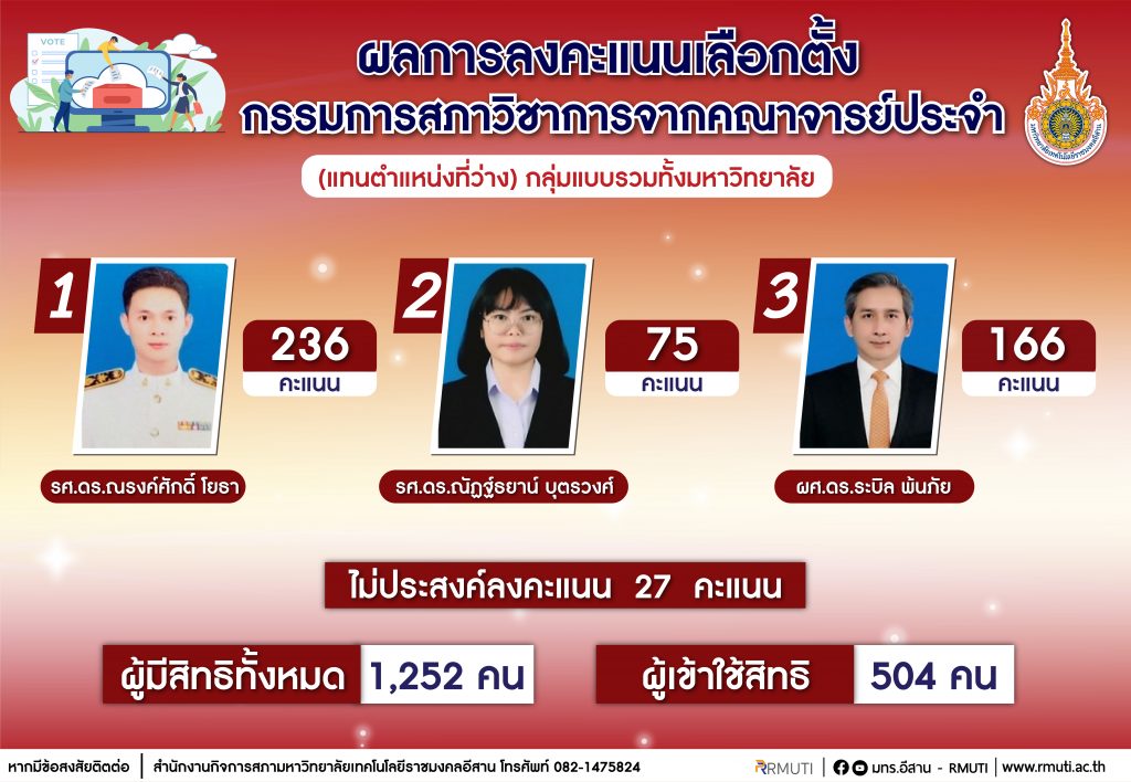 การเลือกตั้งกรรมการสภาวิชาการจากคณาจารย์ประจำ (แทนตำแหน่งที่ว่าง) กลุ่มแบบรวมทั้งมหาวิทยาลัย วิธีทางอิเล็กทรอนิกส์ มีผู้มีสิทธิ์ลงคะแนนเสียงทั้งสิ้น 1,252 คน มีผู้เข้าใช้สิทธิ์ 504 คน ไม่ประสงค์ลงคะแนน 27 คะแนน โดยผลการเลือกตั้งปรากฏว่า