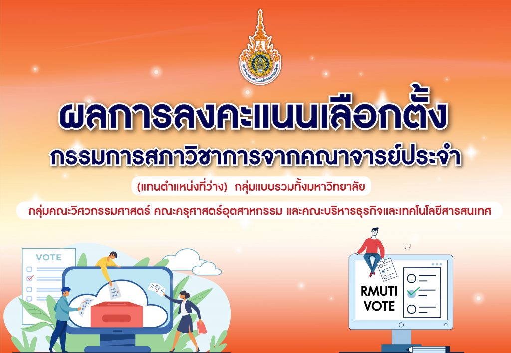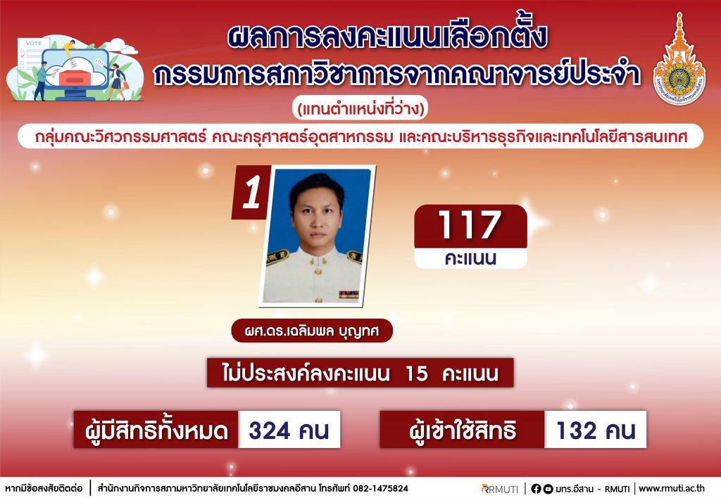 การเลือกตั้งกรรมการสภาวิชาการจากคณาจารย์ประจำ (แทนตำแหน่งที่ว่าง) กลุ่มคณะวิศวกรรมศาสตร์ คณะครุศาสตร์อุตสาหกรรม และคณะบริหารธุรกิจและเทคโนโลยีสารสนเทศ วิธีทางอิเล็กทรอนิกส์ ผู้มีสิทธิ์ลงคะแนนเสียงทั้งสิ้น 324 คน มีผู้เข้าใช้สิทธิ์ 132 คน ไม่ประสงค์ลงคะแนน 15 คะแนน โดยผลการเลือกตั้งปรากกฎว่า ผู้ช่วยศาสตราจารย์ ดร.เฉลิมพล บุญทศ  ได้รับคะแนน 117 คะแนน