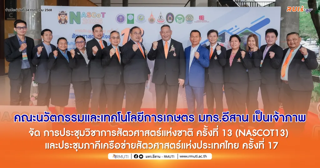 วันที่ 23 กรกฎาคม 2568 นายศิริพล วงศ์รื่น นายกสมาคมสัตวบาลแห่งประเทศไทยในพระราชูปถัมภ์ฯ และ รองศาสตราจารย์ ดร. โฆษิต ศรีภูธร อธิการบดีมหาวิทยาลัยเทคโนโลยีราชมงคลอีสาน นครราชสีมา กล่าวต้อนรับแขกผู้มีเกียรติที่เข้าร่วมพิธีเปิดการประชุมวิชาการสัตวศาสตร์แห่งชาติ ครั้งที่ 13 (NASCOT13) และประชุมภาคีเครือข่ายสัตวศาสตร์แห่งประเทศไทย ครั้งที่ 17 โดยมี ผู้ช่วยศาสตราจารย์ ดร. เฉลิมพล เยื้องกลาง คณบดีคณะนวัตกรรมและเทคโนโลยีการเกษตร เป็นประธานจัดงานการประชุมกล่าวรายงานวัตถุประสงค์โครงการฯ และนางสาวเสาวนีย์ มุ่งสุจริตการ รองผู้อำนวยการสำนักงานการวิจัยแห่งชาติ เป็นประธานในพิธีกล่าวเปิดงานและมอบโล่เกียรติคุณแก่หน่วยงานภาครัฐและเอกชน ระดับ Platinum, ระดับ Gold พร้อมทั้งมีการปาฐกถาพิเศษ ในหัวข้อเรื่อง “How Animal Science can play role on the changing world.?” โดย เมธีวิจัยอาวุโส : ศาสตราจารย์ ดร.เมธา วรรณพัฒน์