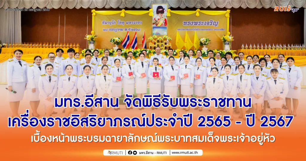 วันที่ 25 กรกฎาคม 2568 มหาวิทยาลัยเทคโนโลยีราชมงคลอีสาน โดย รองศาสตาจารย์ ดร.โฆษิต ศรีภูธร อธิการบดี มทร.อีสาน เป็นประธานในพิธีรับพระราชทานเครื่องราชอิสริยาภรณ์ประจำปี 2565 ประจำปี 2566 และประจำปี 2567 เบื้องหน้าพระบรมฉายาลักษณ์พระบาทสมเด็จพระเจ้าอยู่หัว จัดโดย กองบริหารงานบุคคล มทร.อีสาน ณ หอประชุมวทัญญู ณ ถลาง มหาวิทยาลัยเทคโนโลยีราชมงคลอีสาน โดยมีข้าราชการพลเรือน และพนักงานในสถาบันอุดมศึกษาเข้ารับพระราชทานเครื่องราชอิสริยาภรณ์ จำนวน 19 คน  ได้แก่