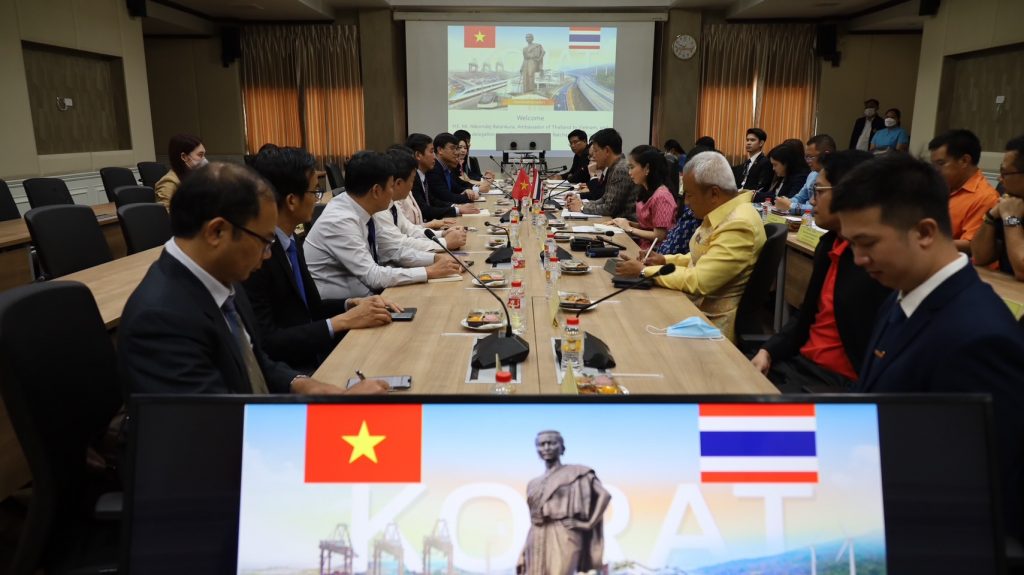 วันที่ 25 พฤษภาคม 2566 รองศาสตราจารย์ ดร.โฆษิต ศรีภูธร อธิการบดี มอบหมายให้ อาจารย์ ดร.อนิรุธ พิพัฒน์ประภา คณบดีคณะบริหารธุรกิจ ร่วมให้การต้อนรับเอกอัครราชทูตณ กรุงฮานอย ในโอกาสเดินทางมาเยือนเพื่อหารือแนวทางส่งเสริมความร่วมมือร่วมกัน มุ่งสู่การพัฒนาอย่างยั่งยืน ที่ห้องประชุมหลวงพ่อคูณปริสุทโธ ชั้น 3 ศาลากลางจังหวัดนครราชสีมา โดยมี นายสยาม ศิริมงคล ผู้ว่าราชการจังหวัดนครราชสีมา พร้อมด้วยส่วนราชการของจังหวัด ร่วมให้การต้อนรับนายนิกรเดช พรางกูล  เอกอัครราชทูต ณ กรุงฮานอย พร้อมคณะ ในโอกาสเดินทางมาเยือนจังหวัดนครราชสีมาและร่วมหารือแนวทางในการส่งเสริมความร่วมมือร่วมกัน โดยมี ส่วนราชการ ภาคเอกชน ร่วมให้การต้อนรับ พร้อมแลกเปลี่ยนข้อมูลไม่ว่าจะเป็นการส่งเสริมเพิ่มขีดความสามารถการแข่งขันด้านการค้า การลงทุน สินค้าบริการ โครงข่ายคมนาคมและโครงสร้างพื้น แนวทางการพัฒนาการท่องเที่ยว การศึกษาสู่ยกระดับการเกษตรที่เป็นระบบเพิ่มมูลค่าและการตลาดที่ครบวงจรบนฐานนวัตกรรมและเทคโนโลยี เป็นต้น