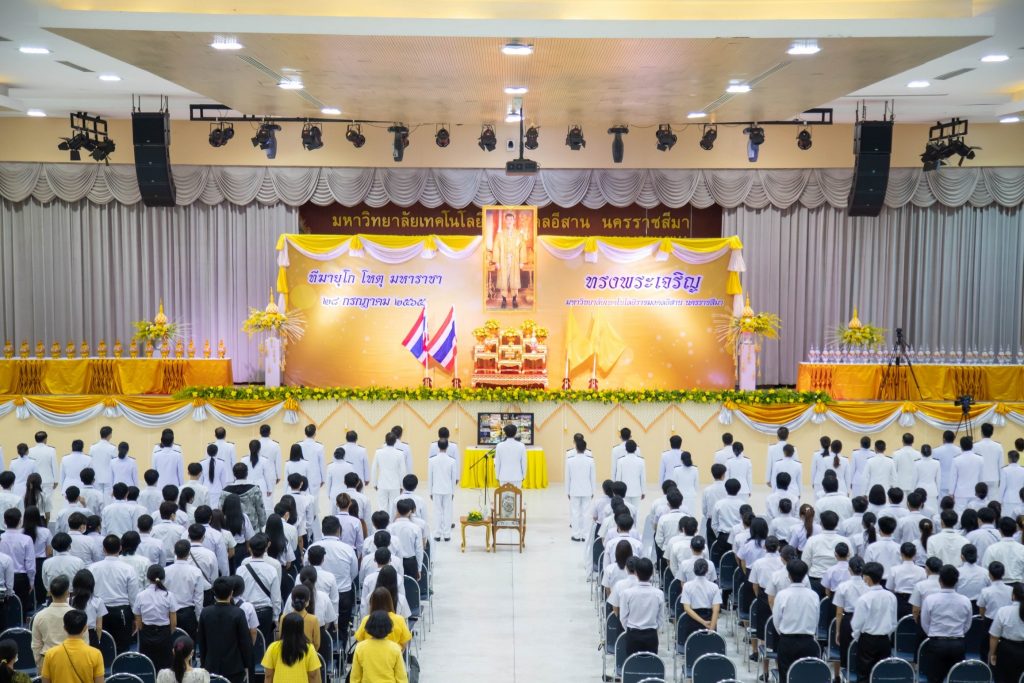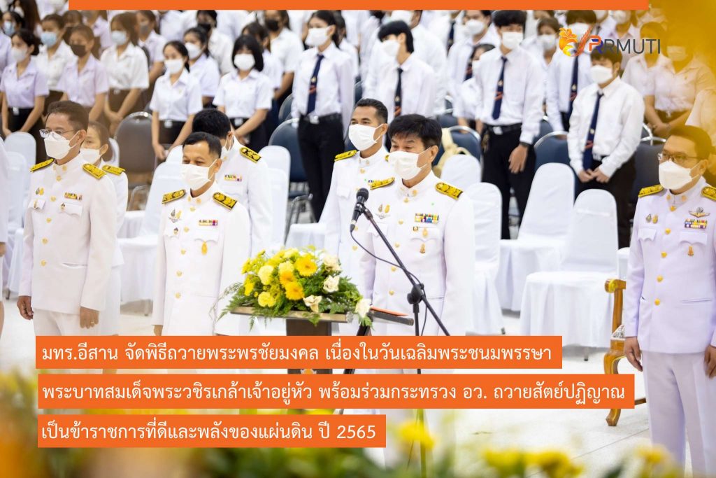 วันที่ 27 กรกฎาคม 2565 มหาวิทยาลัยเทคโนโลยีราชมงคลอีสาน โดย ศูนย์ศิลปวัฒนธรรม มทร.อีสาน จัดพิธีถวายพระพรชัยมงคล พระบาทสมเด็จพระวชิรเกล้าเจ้าอยู่หัว เนื่องในโอกาสมหามงคลวันเฉลิมพระชนมพรรษา 28 กรกฎาคม 2565 ณ หอประชุมวทัญญู ณ ถลาง มทร.อีสาน นครราชสีมา โดยผู้ช่วยศาสตราจารย์ณรงค์ ผลวงษ์ รองอธิการบดีฝ่ายบริหารและพัฒนาทรัพยากรมนุษย์ ประธานในพิธี โดยมีคณะผู้บริหารหน่วยงาน ผู้แทนหน่วยงาน มทร.อีสาน นครราชสีมา ได้ร่วมถวายพานพุ่มเงิน พานพุ่มทอง ตามลำดับ และผู้ช่วยศาสตราจารย์ณรงค์ ผลวงษ์ ประธานในพิธี