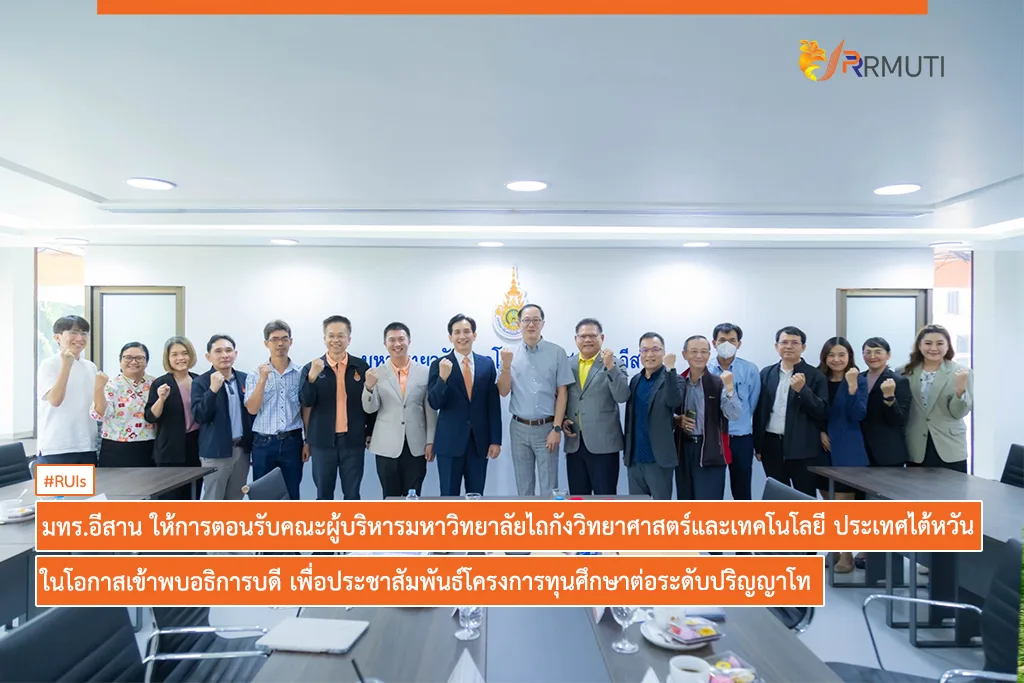 วันที่ 27 สิงหาคม 2567 มหาวิทยาลัยเทคโนโลยีราชมงคลอีสาน โดย รองศาสตราจารย์ ดร.โฆษิต ศรีภูธร อธิการบดี มทร.อีสาน มอบหมายให้ ผู้ช่วยศาสตราจารย์ ดร.ระบิล พ้นภัย ผู้ช่วยอธิการบดี และ อาจารย์ ดร.อนิรุธ พิพัฒน์ประภา คณบดีคณะบริหารธุรกิจ ให้การต้อนรับ รองอธิการบดี คณบดี และที่ปรึกษามหาวิทยาลัยไถกังวิทยาศาสตร์และเทคโนโลยี (Taiwan Steel University of Science and Technology) ประเทศไต้หวัน ณ ห้องแคนา 9 อาคารสำนักงานอธิการบดี (อาคาร19) มหาวิทยาลัยเทคโนโลยีราชมงคลอีสาน นครราชสีมา โดยวัตถุประสงค์ของการเข้าพบในครั้งนี้ เพื่อประชาสัมพันธ์โครงการสนับสนุนให้บัณฑิตระดับปริญญาตรีในประเทศไทย เข้าศึกษาต่อในระดับปริญญาโทภายในมหาวิทยาลัยฯ ในสาขาวิศวกรรมเครื่องกล วิศวกรรมไฟฟ้าและอิเล็กทรอนิกส์ เพื่อเข้าศึกษาต่อภายในมหาวิทยาลัยไถกังวิทยาศาสตร์และเทคโนโลยี (Taiwan Steel University of Science and Technology) ประเทศไต้หวัน โดยยกเว้นค่าเล่าเรียน ค่าหอพัก และหลังจบการศึกษาสามารถเข้าทำงานในประเทศไต้หวันได้ หรือเลือกที่จะศึกษาต่อในระดับปริญญาเอกต่อไปได้