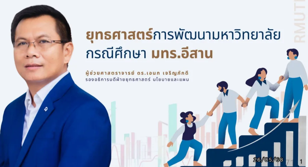มหาวิทยาลัยเทคโนโลยีราชมงคลอีสาน โดย รองศาสตราจารย์ ดร.โฆษิต ศรีภูธร อธิการบดีมหาวิทยาลัยเทคโนโลยีราชมงคลอีสาน มอบหมายให้ ผู้ช่วยศาสตราจารย์ ดร.เอนก เจริญภักดี รองอธิการบดีฝ่ายยุทธศาสตร์นโยบายและแผน เป็นวิทยากรในโครงการอบรมเชิงปฏิบัติการ “การทบทวนแผนยุทธศาสตร์มหาวิทยาลัย ราชภัฏนครสวรรค์ ระยะที่ 2 (พ.ศ. 2566 – 2570) ฉบับปรับปรุง ปี พ.ศ. 2568” เมื่อวันที่ 26 พฤษภาคม 2568 ณ มหาวิทยาลัยราชภัฏนครสวรรค์ จังหวัดนครสวรรค์