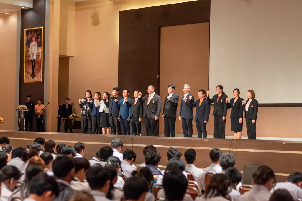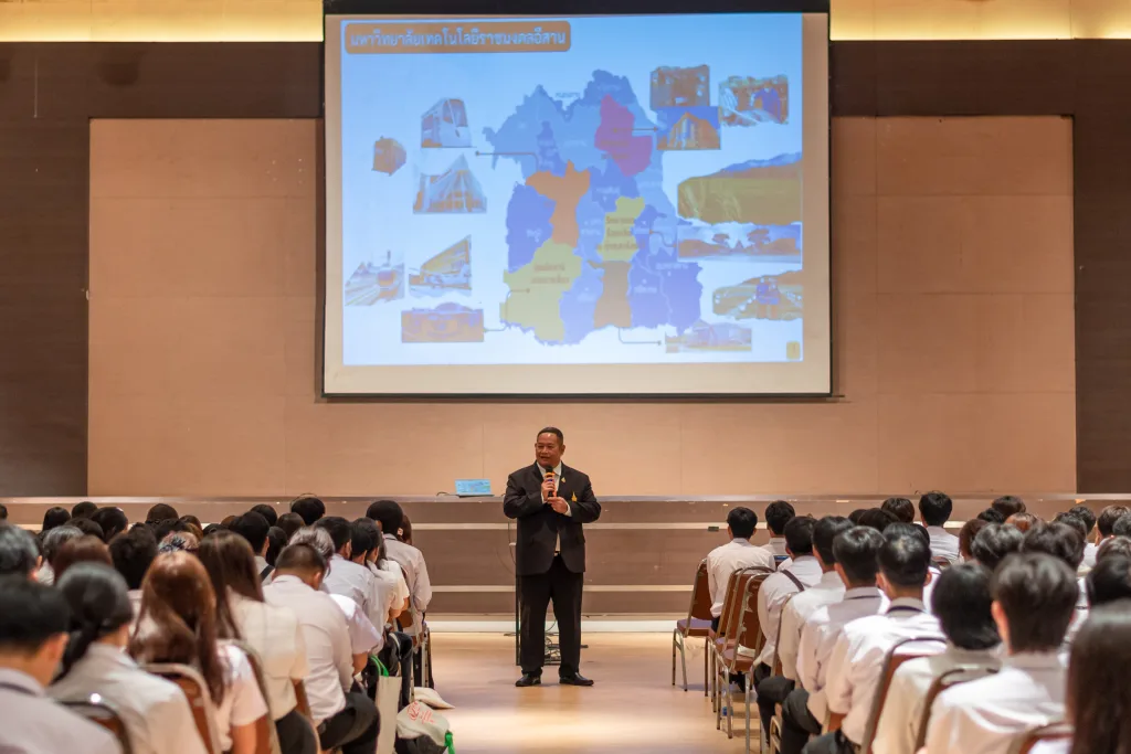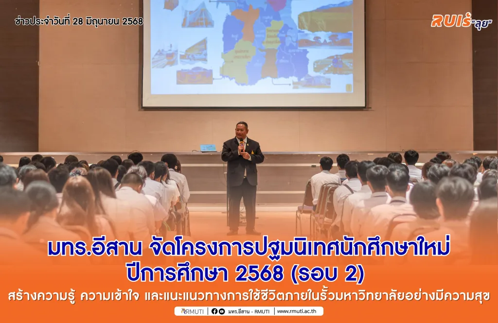 วันที่ 28 มิถุนายน 2568 มหาวิทยาลัยเทคโนโลยีราชมงคลอีสาน โดย กองพัฒนานักศึกษา จัดโครงการปฐมนิเทศนักศึกษาใหม่ ประจำปีการศึกษา 2568 (รอบ 2) ของมหาวิทยาลัยเทคโนโลยีราชมงคลอีสาน นครราชสีมา ซึ่งมีผู้บริหารมหาวิทยาลัย คณบดี ผู้บริหารทุกคณะ และนักศึกษาใหม่จำนวนกว่า 800 คน ร่วมในพิธีปฐมนิเทศอย่างพร้อมเพรียงและอบอุ่น ในช่วงเช้า ได้รับเกียรติจาก รองศาสตราจารย์ ดร.โฆษิต ศรีภูธร อธิการบดี มทร.อีสาน กล่าวแสดงความยินดีและกล่าวต้อนรับพร้อมให้โอวาทแก่นักศึกษาใหม่ ประจำปีการศึกษา 2568 (รอบ 2) หรือ แคแสดช่อที่ 21 ตะโกรายรุ่นที่ 70 พร้อมทั้งได้แนะนำคณะผู้บริหารมหาวิทยาลัยให้แก่นักศึกษาได้รู้จักด้วย