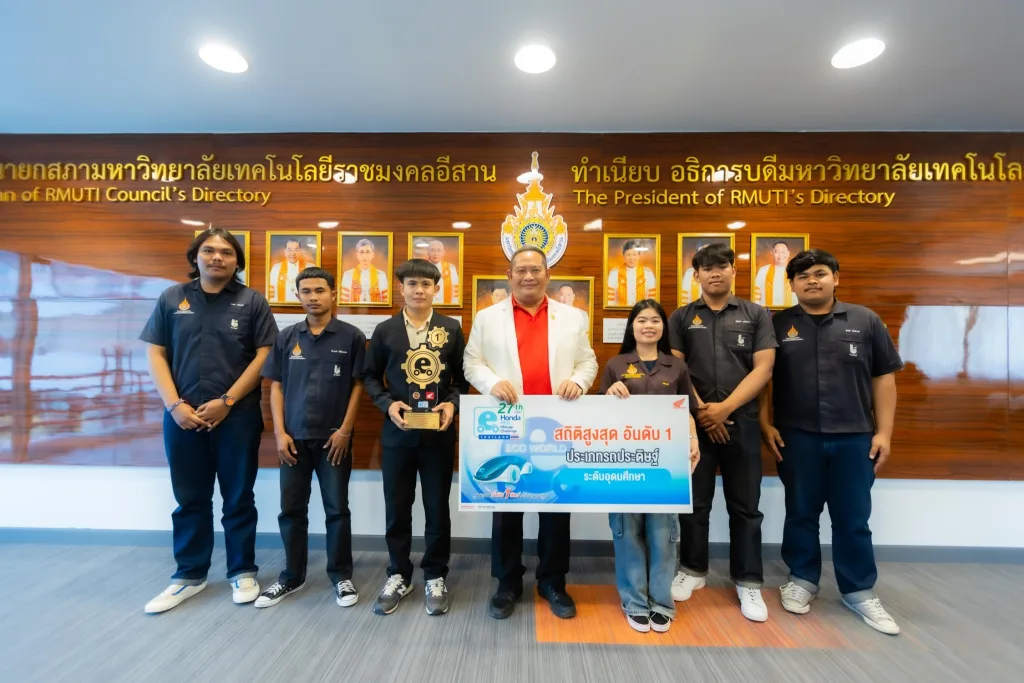 วันที่ 29 มกราคม 2568 คณาจารย์วิทยาลัยนวัตกรรมวิชาชีพ คณะวิศกรรมศาสตร์และเทคโนโลยี มหาวิทยาลัยเทคโนโลยีราชมงคลอีสาน นำนักศึกษาซึ่งเข้าร่วมการแข่งขัน “ฮอนด้าประหยัดเชื้อเพลิง ปีที่ 27 (27th Honda Econo Mileage Challenge)” จัดโดยบริษัท A.P. Honda ประเทศไทย จำกัด ร่วมกับ สำนักงานคณะกรรมการการอาชีวศึกษา เข้าพบ รองศาสตราจารย์ ดร.โฆษิต ศรีภูธร อธิการบดี มทร.อีสาน เพื่อรายงานผลการแข่งขัน “ฮอนด้าประหยัดเชื้อเพลิง ปีที่ 27 (27th Honda Econo Mileage Challenge)” ในวันที่ 15-16 มกราคม 2568 ณ สนามช้างอินเตอร์เนชั่นแนลเซอร์กิต จ.บุรีรัมย์ ที่ผ่านมา ในการนี้ รองศาสตราจารย์ ดร.โฆษิต ศรีภูธร อธิการบดี มทร.อีสาน ได้กล่าวชื่นชม พร้อมมอบของที่ระลึกแก่นักศึกษาที่ได้รับรางวัลจากการแข่งขันเพื่อเป็นขวัญและกำลังใจ พร้อมกันนี้ยังให้โอวาทและอวยพรแก่นักศึกษาที่จะเป็นตัวแทนประเทศไทย ได้แก่ ทีม “ตะโกราย 2” สมาชิกประกอบด้วยนักศึกษา ได้แก่ นางสาววรัญญา ปลั่งกลาง (ผู้ขับขี่) นายธนดล มีระหันนอก (ช่างเทคนิค 1) นายวชิระภาส ชาญชัย (ช่างเทคนิค 2) นายสิริวัฒน์ งวงช้าง (ธุรการ) คว้ารางวัลชนะเลิศ โดยทำสถิติอยู่ที่ 764.965 Km/L และยังคว้ารางวัล Popular Votes มาอีก 1 รางวัล