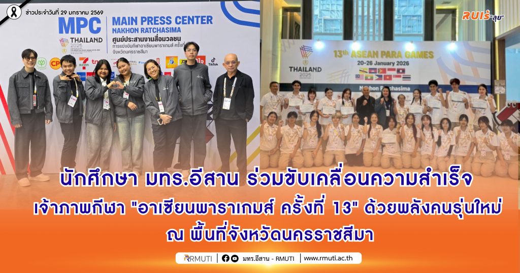 วันที่ 20-26 มกราคม 2569 มหาวิทยาลัยเทคโนโลยีราชมงคลอีสาน ส่งนักศึกษาเข้าร่วมปฏิบัติหน้าที่สนับสนุนการแข่งขันกีฬาอาเซียนพาราเกมส์ ครั้งที่ 13 (13th ASEAN Para Games) ซึ่งจัดขึ้นระหว่างวันที่ 20-26 มกราคม 2569 ณ จังหวัดนครราชสีมา โดยมี คณะอาจารย์มทร.อีสาน ร่วมกำกับดูแล นำโดย อาจารย์กฤศณัฏฐ์ พุฒิธนสมบัติ, อาจารย์ฉัตราพร จันทร์นาค, อาจารย์สรินทร์ภัสร์ ชูธรัตน์ ผศ.ดร. มนัสสิริ คงรัศมี และอาจารย์กมลทิพย์ นวมโคกสูง ได้นำทีมนักศึกษาจากหลากหลายคณะและสาขาวิชา ประกอบด้วย นักศึกษาจากสาขาวิชาภาษาอังกฤษเพื่อการสื่อสาร สาขาวิชาท่องเที่ยวและการบริการ สาขาวิชาวิทยาศาสตร์การกีฬาและสุขภาพ คณะวิทยาศาสตร์และศิลปะศาสตร์, นักศึกษาจากคณะสถาปัตยกรรมศาสตร์และศิลปกรรมสร้างสรรค์ และนักศึกษาจากคณะบริหารธุรกิจ