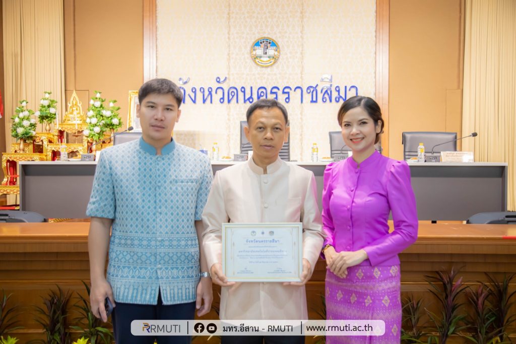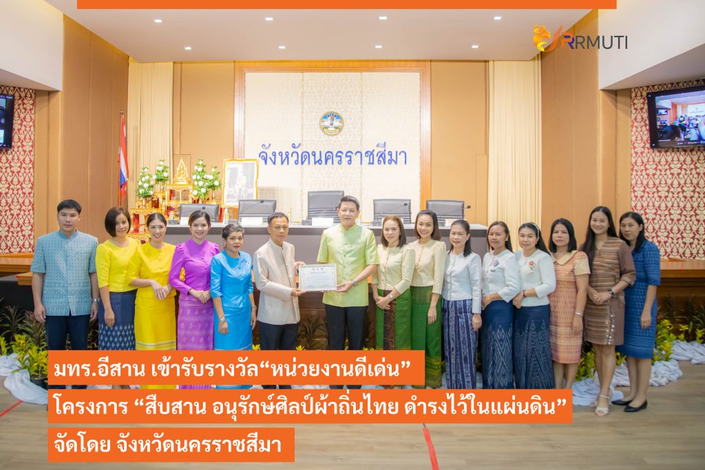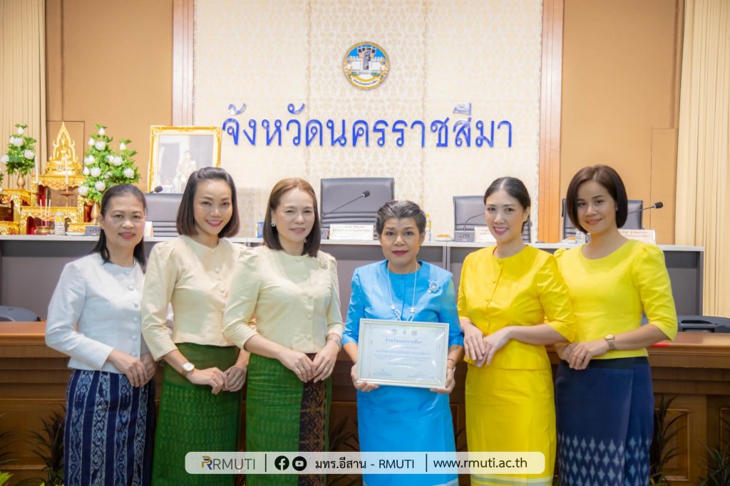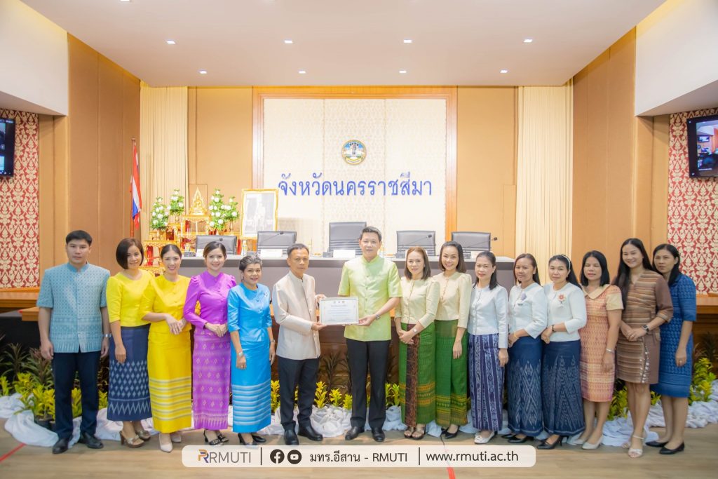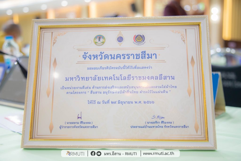 วันที่ 29 มิถุนายน 2566 มหาวิทยาลัยเทคโนโลยีราชมงคลอีสาน โดยรองศาสตราจารย์ ดร.โฆษิต ศรีภูธร อธิการบดี มทร.อีสาน มอบหมายให้ ผู้ช่วยศาสตราจารย์สุรพจน์ วัชโรภากุล รองอธิการบดีฝ่ายบริหารและพัฒนาทรัพยากรมนุษย์ พร้อมด้วย ดร.ศิริลักษณ์ จันทร์สว่าง ผู้อำนวยการสำนักงานอธิการบดี นางฐิตานันท์ จิตติวัชราพงศ์ รักษาราชการแทนผู้อำนวยการกองคลัง นางสุปัญญา คล้ายคลึง รักษาราชการแทนผู้อำนวยการกองกลาง นางสาวรัญชิดา สาระวิถี รักษาราชการแทนผู้อำนวยการกองบริหารงานบุคคล นางสาวสุวรรณี ทนงสำโรง พลเสน รักษาราชการแทนผู้อำนวยการกองพัฒนานักศึกษา พร้อมด้วย บุคลากร มทร.อีสาน เข้ารับมอบใบประกาศเกียรติติคุณ แก่ “หน่วยงานที่มีความดีเด่นด้านการส่งเสริมและสนับสนุนการใช้และสวมใส่ผ้าไทย” จาก นายสยาม ศิริมงคล ผู้ว่าราชการจังหวัดนครราชสีมา ตามโครงการ “สืบสาน อนุรักษ์ศิลป์ผ้าถิ่นไทย ดำรงไว้ในแผ่นดิน” ณ หอประชุมเปรมติณสูลานนท์ ศาลากลางจังหวัดนครราชสีมา