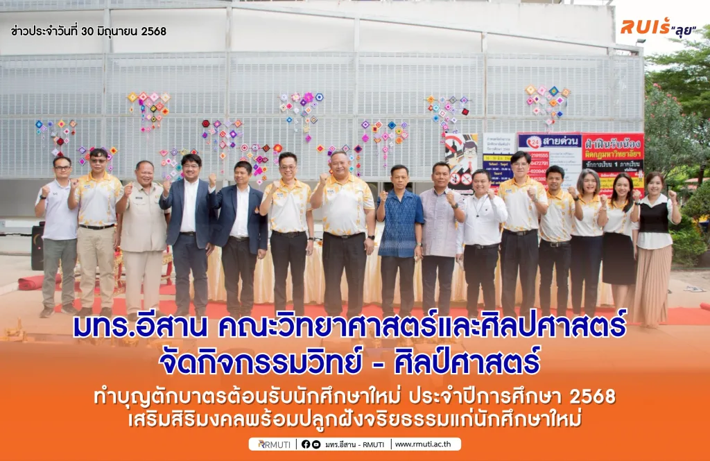 วันที่ 30 มิถุนายน 2568 มหาวิทยาลัยเทคโนโลยีราชมงคลอีสาน โดย ฝ่ายพัฒนานักศึกษา คณะวิทยาศาสตร์และศิลปศาสตร์ จัดกิจกรรมวิทย์ – ศิลป์ศาสตร์ ทําบุญตักบาตรต้อนรับนักศึกษาใหม่ ประจําปีการศึกษา 2568 ณ บริเวณลานหน้าอาคารปฏิบัติการคณะวิทยาศาสตร์และศิลปศาสตร์ (อาคาร 34) ในการนี้ได้รับเกียรติจาก รองศาสตราจารย์ ดร.โฆษิต ศรีภูธร อธิการบดี มทร.อีสาน เป็นประธานเปิดงานพร้อมร่วมทำบุญตักบาตรอาหารแห้ง ร่วมกับ ผู้ช่วยศาสตราจารย์ ดร.ชาคริต นวลฉิมพลี คณบดีคณะวิทยาศาสตร์และศิลปศาสตร์ คณะผู้บริหารคณะ คณาจารย์ และนักศึกษา
