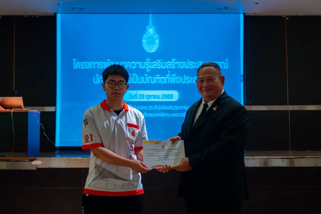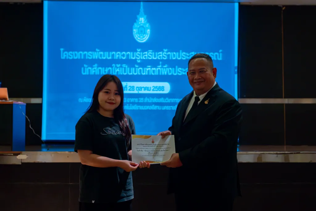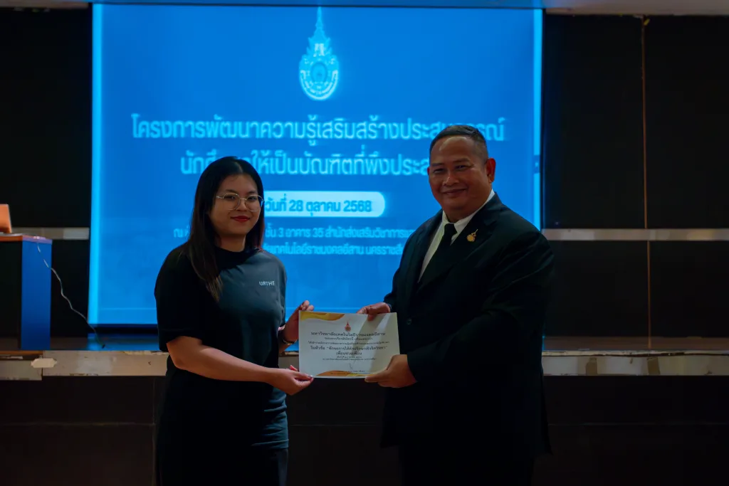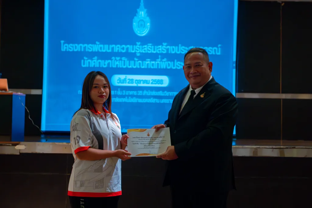 วันที่ 28 ตุลาคม 2568 มหาวิทยาลัยเทคโนโลยีราชมงคลอีสาน โดย กองพัฒนานักศึกษา จัดโครงการพัฒนาความรู้เสริมสร้างประสบการณ์นักศึกษาให้เป็นบัณฑิตที่พึงประสงค์ ณ ห้องตะโกราย 1 อาคารสำนักส่งเสริมวิชาการและงานทะเบียน มหาวิทยาลัยเทคโนโลยีราชมงคลอีสาน นครรราชสีมา ในการนี้ได้รับเกียรติจากรองศาสตราจารย์ ดร.โฆษิต ศรีภูธร รักษาราชการแทน อธิการบดี มทร.อีสาน เป็นประธานในพิธี พร้อมมอบเกียรติบัตรให้แก่ผู้เข้าร่วมโครงการ และจากนั้นเป็นการบรรยาย เรื่อง “คุณลักษณะของบัณฑิตที่พึงประสงค์ของมหาวิทยาลัยเทคโนโลยีราชมงคลอีสาน ตามกรอบมาตรฐานคุณวุฒิระดับอุดมศึกษา (TQF)” โดยอาจารย์ สรวิศ ต.ศิริวัฒนา รองอธิการบดีฝ่ายกิจการนักศึกษาและศิษย์เก่าสัมพันธ์ และการบรรยายให้ความรู้ เรื่อง ทักษะการให้คำปรึกษาเชิงจิตวิทยา” เรื่อง“เพื่อนช่วยเพื่อน” โดย คุณสันทัด ผลจันทร์ พยาบาลวิชาชีพชำนาญการ และคุณพลากร ศรีพูนทอง นักจิตวิทยาโรงเรียนประจำสำนักงานเขตพื้นที่การศึกษา