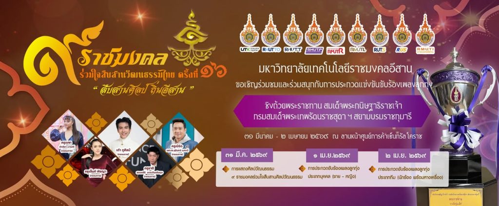 ทั้งนี้ “ขอเชิญชวน นักเรียน นักศึกษา พี่น้องประชาชนชาวโคราช เข้าร่วมชมการแสดงศิลปวัฒนธรรม การประกวดขับร้องเพลงลูกทุ่งทั้งประเภทบุคคล (ชาย-หญิง) และประเภททีม (นักร้องพร้อมหางเครื่อง) ในโครงการ 9 ราชมงคล ร่วมสืบสานวัฒนธรรมไทย และกิจกรรมสัมมนาเชิงปฏิบัติการเพื่อพัฒนาเครือข่ายประกันคุณภาพกิจกรรมนักศึกษา 9 มทร. ครั้งที่ 16 “สืบสานศิลป์ ถิ่นอีสาน” ในระหว่างวันที่ 30 มีนาคม  – 3 เมษายน 2569 ณ ลานหน้าศูนย์การค้าเซ็นทรัล โคราช