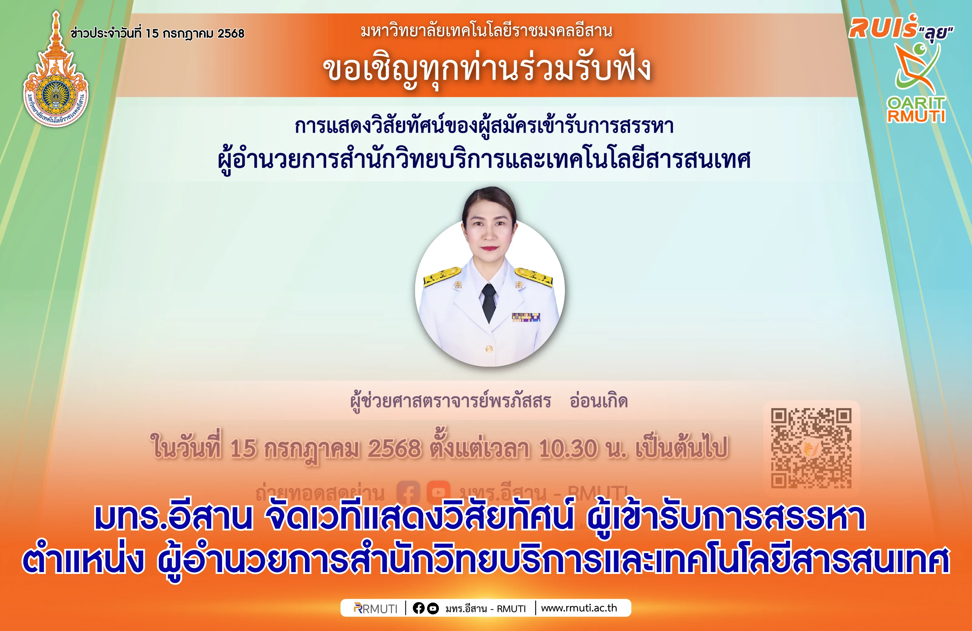 วันที่ 15 กรกฎาคม 2568 มหาวิทยาลัยเทคโนโลยีราชมงคลอีสาน […]